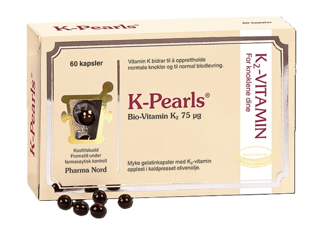 K-Pearls er små, bløte gelatinkapsler, hvor hver kapsel inneholder 75 µg ren vitamin K2 (menakinon MK-7). K2-vitaminet er løst i kaldpresset olivenolje for å forbedre opptaket. Kapslenes størrelse gjør dem lette å svelge, men de kan også tygges. Ta K-Pearls til et måltid.